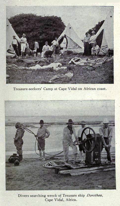 "Treasure-seekers camp at Cape Vidal on African coast" and "Divers searching wreck of treasure ship Dorothea, Cape Vidal, Africa".